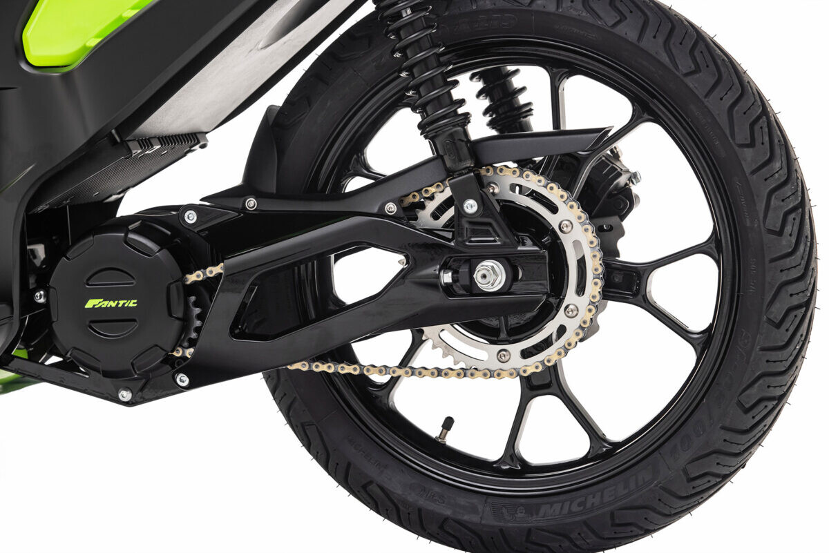 El chasis del ciclomotor está fabricado con aluminio fundido de tipo Trellis. El ciclomotor cuenta con ruedas grandes de 16 pulgadas y frenos de disco delanteros y traseros. La altura libre al suelo es de 750mm.