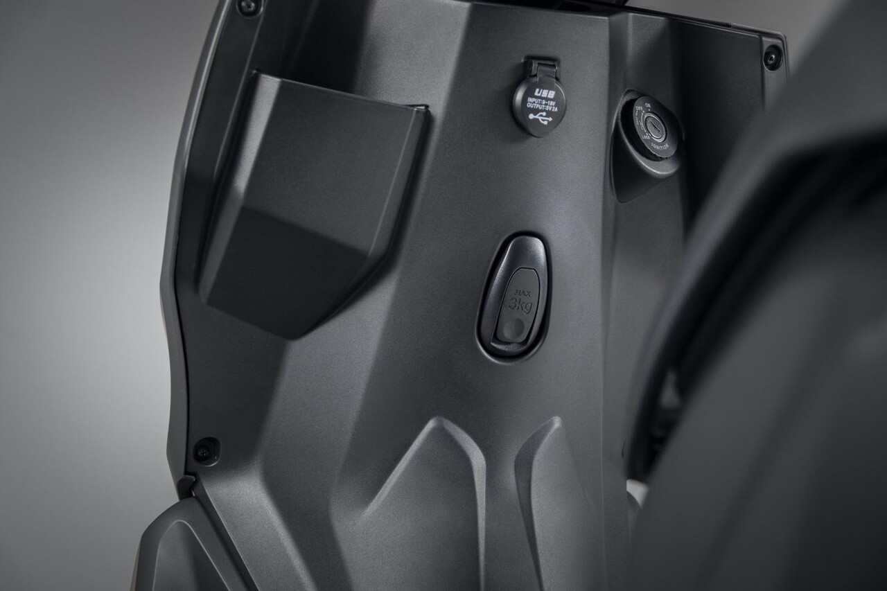 El patinete cuenta con un panel digital, compartimentos de almacenamiento y puertos USB para cargar un teléfono móvil.