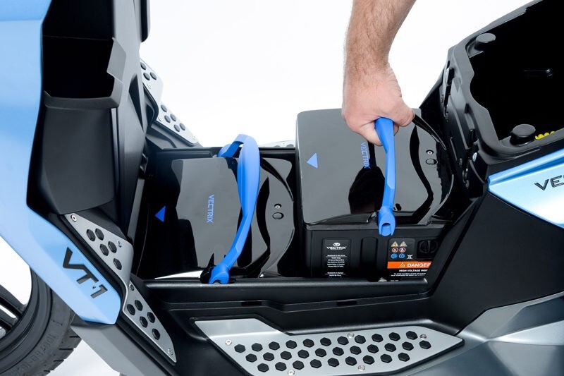 El Vectrix VT-1 está equipado con baterías extraíbles y fáciles de manejar. El sistema permitirá usar el vehículo con 1, 2 o 3 módulos de batería independientes con una autonomía de hasta 160 km.
